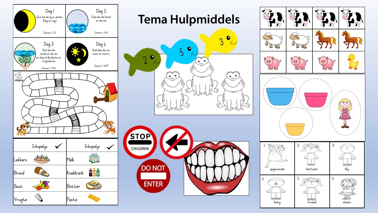 - Tema hulpmiddels vir die aktiwiteite of speletjies indien nodig volgens die lesbeplanning.