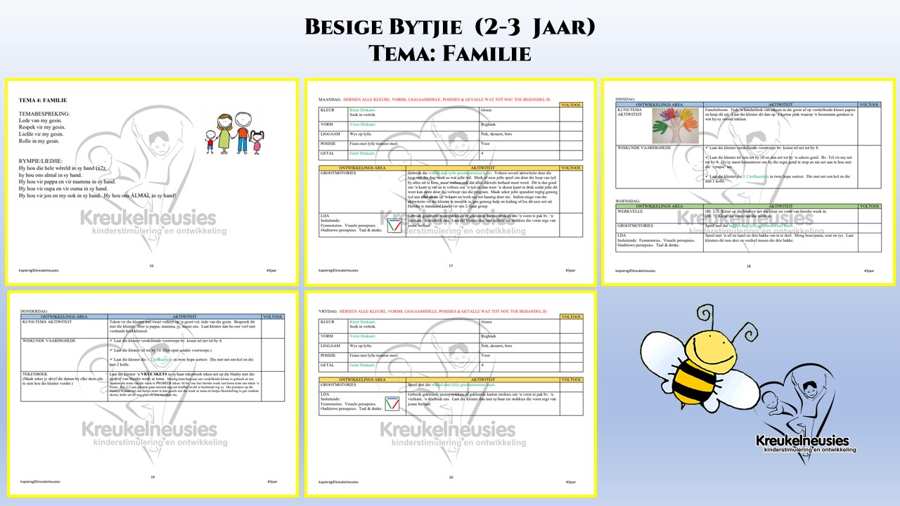 - Tema hulpmiddels vir die aktiwiteite of speletjies indien nodig volgens die lesbeplanning.